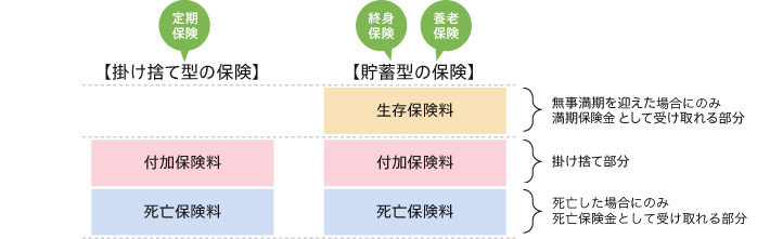 一方、貯蓄型保険には、付加保険料と死亡保険料に加え、満期保険金などに充てられる“生存保険料”が保険料に含まれています。そのため、無事契約が満期を迎えれば、それまで積み立てられた生存保険料が満期保険金として受け取れます。